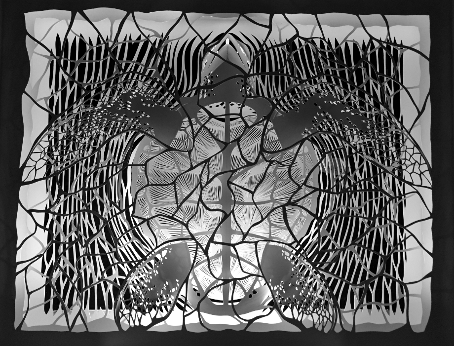 80cm hauteur X 100cm longeur X 25cm profondeur. Carton blanc de 1mm, 3mm, découpé et collé ensemble. 330 heures de travail.