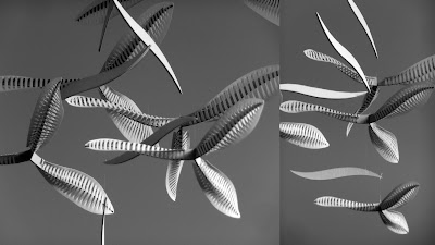 Mi-pétal, mi-hélice, les éléments vrillent et tournent sur des axes multiples faisant une danse faite d'air et de lumière.
